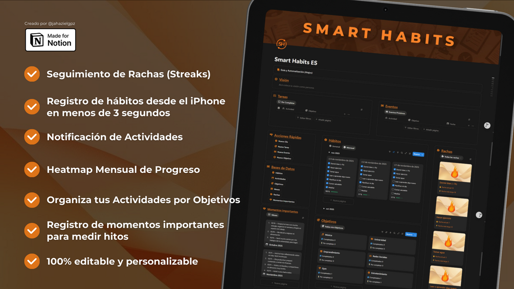 Puedes conectar Smart Habits con tres atajos exclusivos para registrar tus hábitos directamente desde tu celular, en segundos, sin abrir Notion.